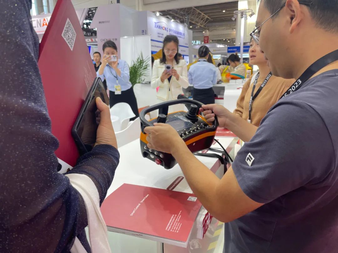 無(wú)人化也是本次展會(huì)的核心之一,在展臺(tái)另一側(cè),多款無(wú)線遙控設(shè)備也得到了客戶的廣泛關(guān)注。eTelecom系列遙控系統(tǒng),發(fā)射器面板可根據(jù)客戶的功能需求進(jìn)行非標(biāo)定制,面板可以安裝單軸遙控、雙軸遙控、電位計(jì)、選擇開關(guān)、撥動(dòng)開關(guān)等。不僅品質(zhì)可靠,并且采用符合人體力學(xué)的腰跨式設(shè)計(jì),在工程機(jī)械、林業(yè)機(jī)械、港口機(jī)械等領(lǐng)域廣泛應(yīng)用。